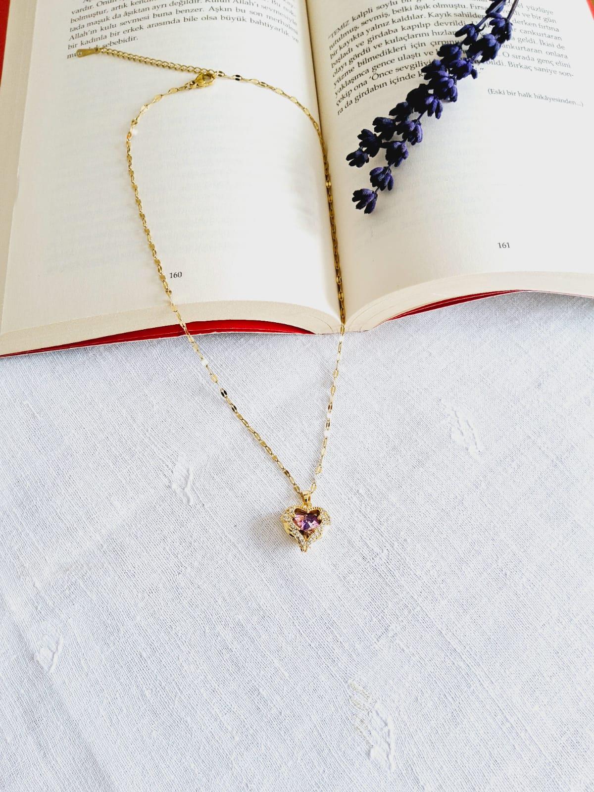0106224 Pembe Taşlı Kalp Çelik Kolye (Gold)