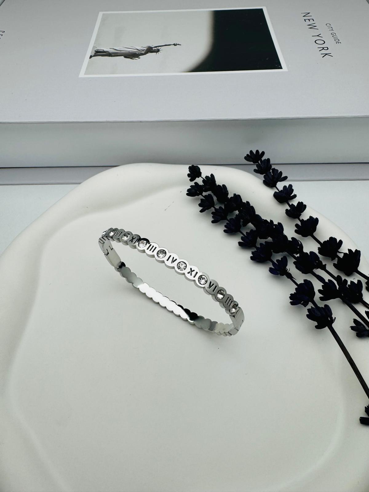 Taş Detaylı Romen Rakamlı Çelik Kelepçe (Gümüş) 22011
