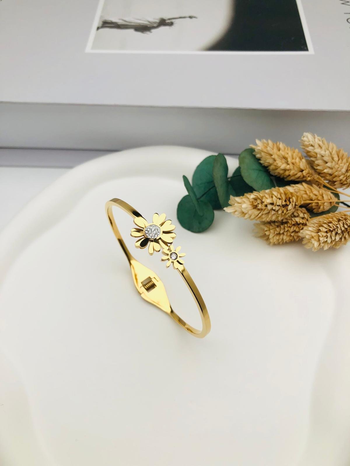 Taşlı Ve Çiçek Detaylı Çelik Kelepçe (Gold)2186